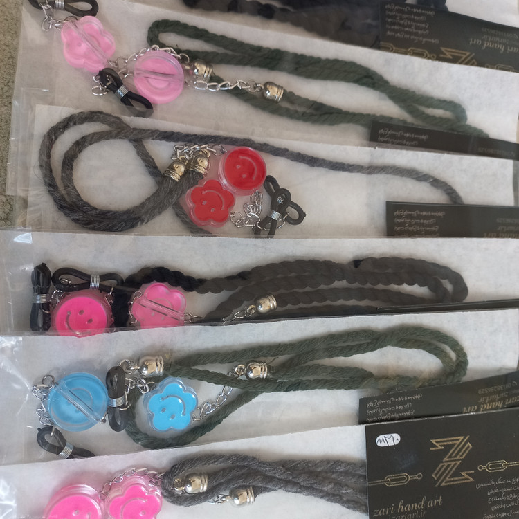 بند عینک ساخته شده با مکرومه کتان ۴ میلیمتر، زنجیر طلایی و نقره ای رنگ ثابت و مهره استیکر لبخند دایره و گل