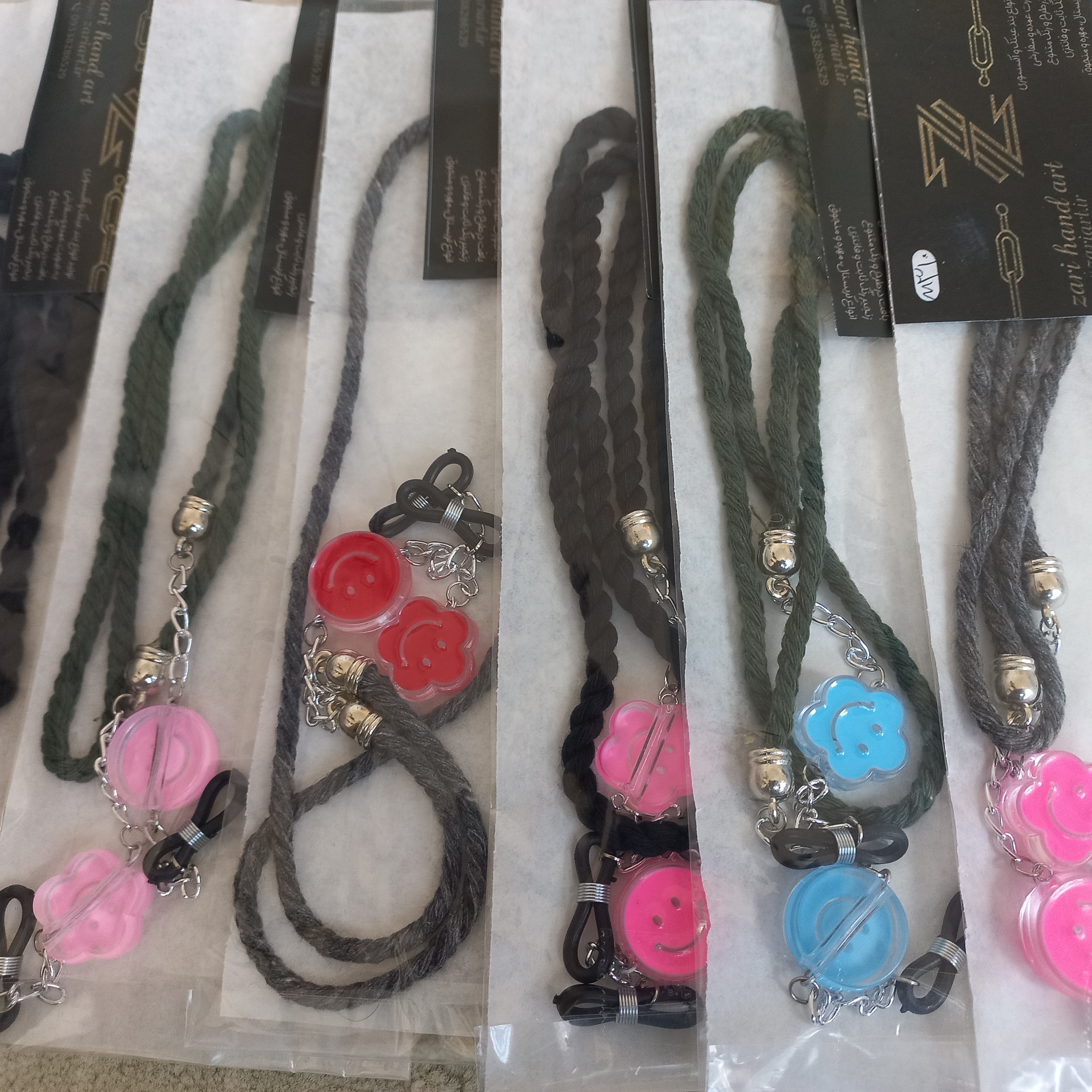بند عینک ساخته شده با مکرومه کتان ۴ میلیمتر، زنجیر طلایی و نقره ای رنگ ثابت و مهره استیکر لبخند دایره و گل